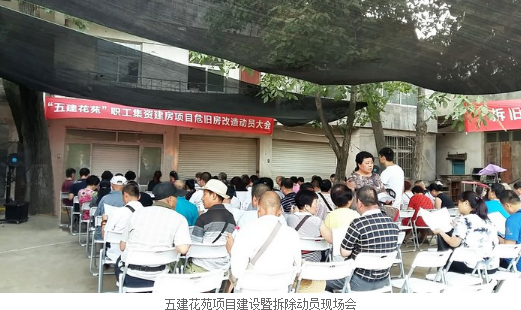 為進一步推進浐河東岸“五建花苑”職工住房項目建設(shè),保障拆除安置工作平穩(wěn)有序高效進行。2017年7月14日,職工服務(wù)中心在原五公司木材廠(28畝地)召開了五建花苑項目建設(shè)暨拆除動員現(xiàn)場會?,F(xiàn)場會邀請了90余戶住戶及西建五公司領(lǐng)導出席參加。