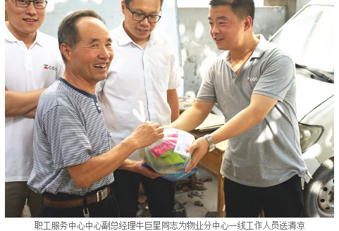 同時,中心副總經(jīng)理牛巨星同志帶隊,對物業(yè)分中心的一線工作人員進行了慰問,發(fā)放了防暑降溫品,確保托管老舊小區(qū)安全度夏。