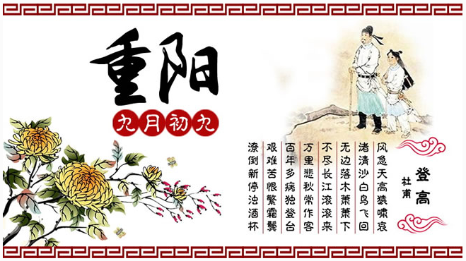 重陽節(jié)是中華民族的傳統(tǒng)節(jié)日,《易經(jīng)》中把“六”定為陰數(shù),把“九”定為陽數(shù),九月九日,日月并陽,兩九相重,故曰重陽,也叫重九。慶祝重陽節(jié)一般包括出游賞秋、登高遠眺、觀賞菊花、遍插茱萸、吃重陽糕、飲菊花酒等活動。1989年農(nóng)歷九月九日被定為老人節(jié),倡導全社會樹立尊老、敬老、愛老、助老的風氣。