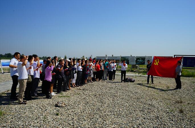 全體黨員在澇河渼陂水系生態(tài)修復(fù)施工現(xiàn)場(chǎng)重溫入黨誓詞
