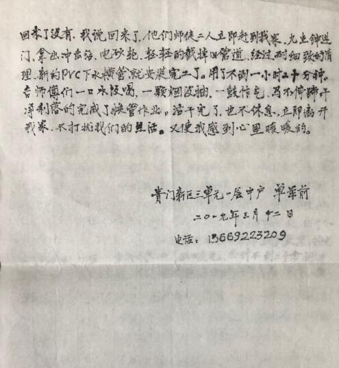近日,棗園小區(qū)(青門新區(qū))住戶單先生向中心物業(yè)管理服務(wù)事業(yè)部送來一封感謝信,向城北服務(wù)區(qū)的物業(yè)服務(wù)人員及維修師傅們表示衷心的感謝。