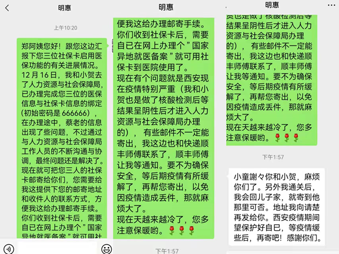 在老人單位的配合下,雙方一同前往市醫(yī)保經(jīng)辦中心修改職工醫(yī)?;拘畔?,并獲取綁定信息所需材料。過程中又發(fā)現(xiàn)老人未及時反饋證件信息更新的情況,此外還遇到個人養(yǎng)老認證綁定信息的確定、市人社系統(tǒng)內(nèi)無法查詢其中1位老人信息、疫情形式嚴峻等問題。工作人員克服重重困難,最終將鄭明慧老人及其他2位老人的社保卡與醫(yī)保信息成功綁定。至此,耗時近10個月,平臺事業(yè)部成功協(xié)助3位居住在香港的退休職工領(lǐng)取到社???,并將職工醫(yī)保信息綁定到其社??ā?/span>