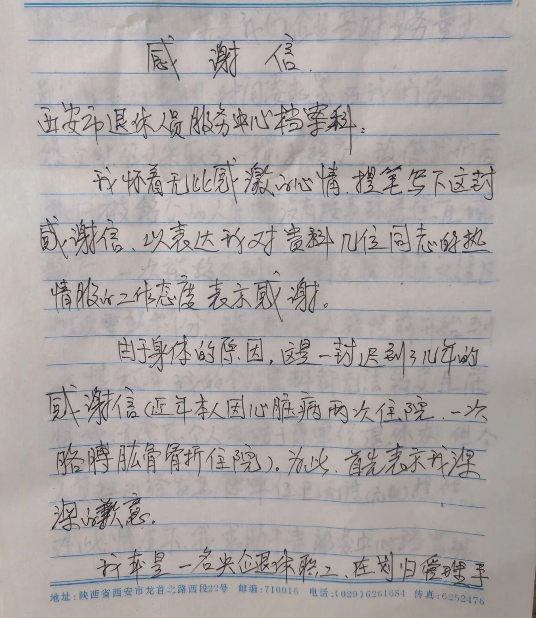 “退休人員服務(wù)中心,就像一座橋梁連接著退體人員與單位的情感,就像一盞明燈,照亮了退休人員,讓我體會(huì)到了“服務(wù)為民”的真諦,也看到了你們身上閃耀著的責(zé)任與擔(dān)當(dāng),你們用實(shí)際行動(dòng)踐行著“尊老敬老”的傳統(tǒng)美德,也讓我們退休人員感受到家一般的溫暖。”——這是央企退休人員陳紫英寫給西安市國(guó)有企業(yè)退休人員服務(wù)中心《感謝信》里的一段話,老人情真意切,感謝之意溢出紙面。