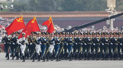 閱兵式上,空中梯隊組成“80”字樣,昭示偉大抗戰(zhàn)精神永恒不朽??罩凶o旗方隊、徒步方隊、裝備方隊、戰(zhàn)旗方隊、空中梯隊等威武雄壯。腳步鏗鏘,英姿颯爽,鐵流滾滾,銳不可當。各種新式兵種及軍隊裝備,充分展示了我軍在新形勢下強大的軍事防御及戰(zhàn)斗力,